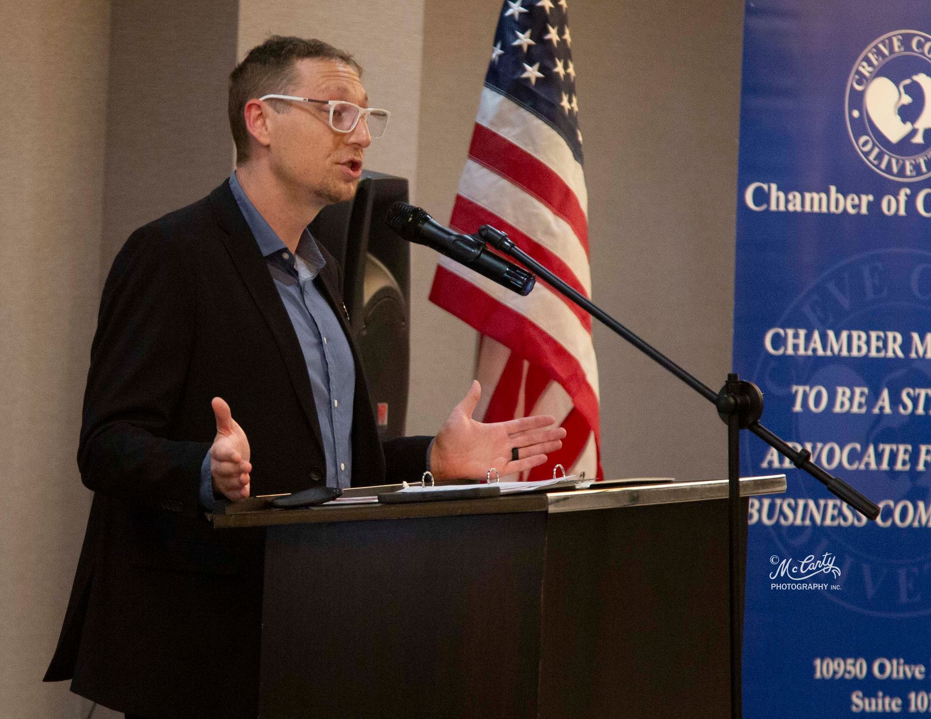On Thursday, September 21, 2023 we had our Membership Luncheon at the Holiday Inn St. Louis in Creve Coeur. As our President-Elect for the Chamber Board, Dr. Paul Hyland stood in for our President, Mo Riad, in bringing our luncheon to order and welcoming our City Officials, Guests, and Members. After saying the Pledge of Allegiance we thanked our Luncheon Sponsor, Mark St. George with Zoplex Media Group, and invited him to share on how he supports businesses in growing their sales through digital marketing. Next we introduced our Ambassadors and presented plaques to our new members (pictured above from left to right):
