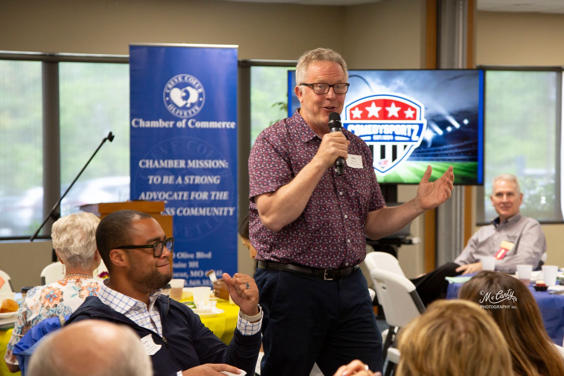 After enjoying lunch and networking at the tables we introduced our speaker, Mike McGuire with ComedySportz St. Louis. Mike uses improv principles and exercises to help people think on their feet, work more effectively as a team, and to be more confident in every situation. Click here for Mike's info.