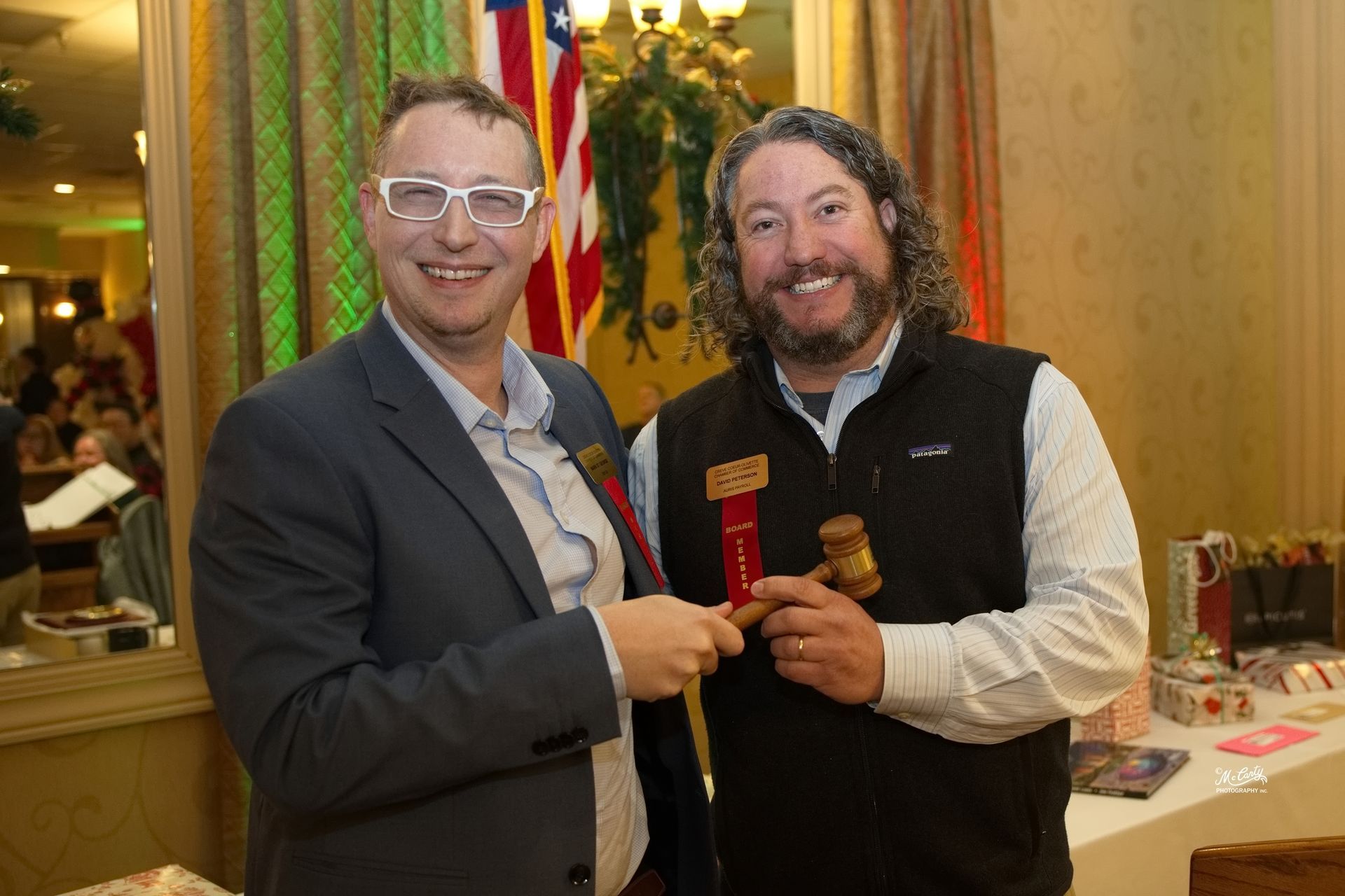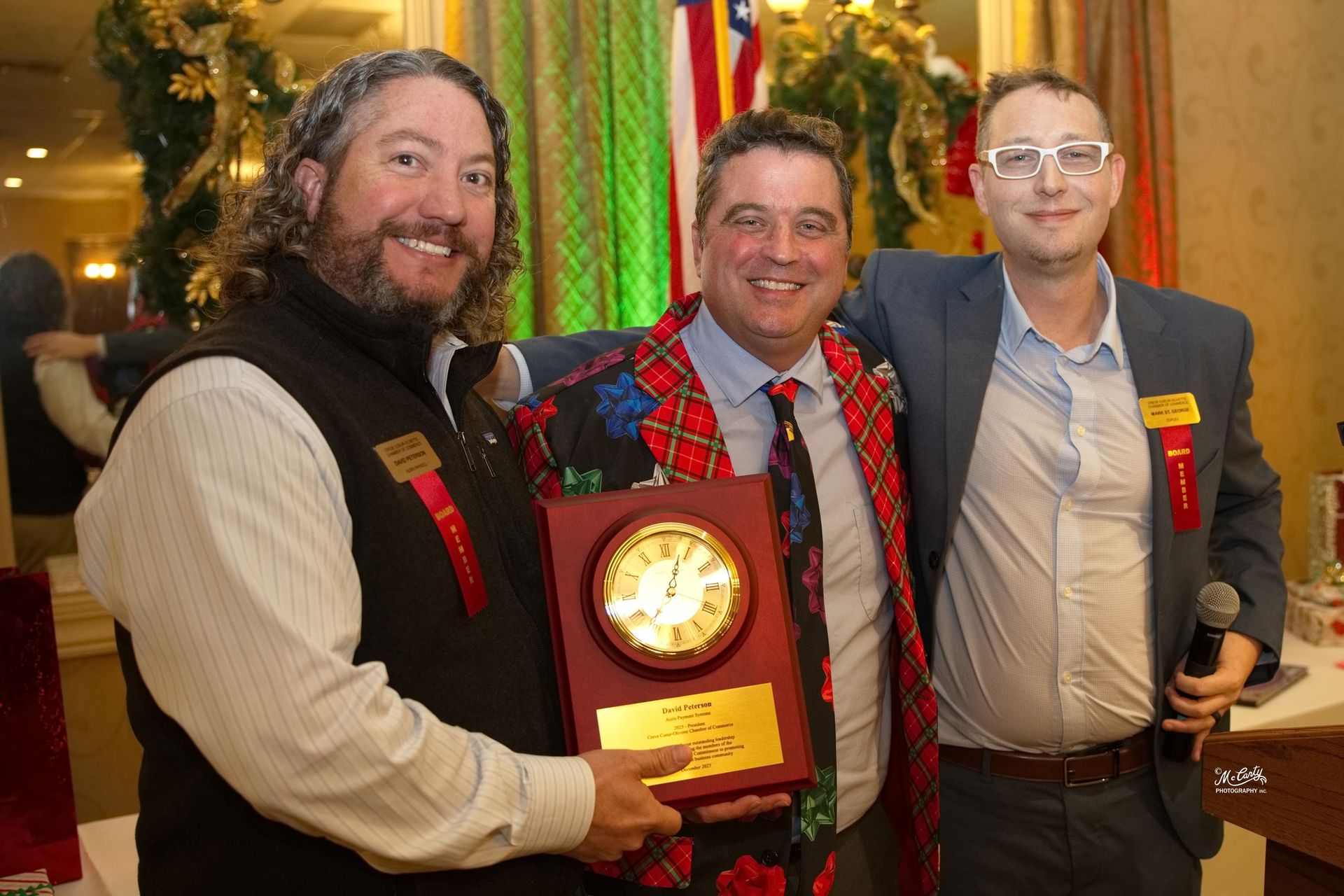 Next, David Peterson with Auris Payroll and our current Chamber Board President, presented Mark St. George with Zoplex, the President's Gavel, and introduced him as our 2026 Chamber Board President. As Mark's first duty as president, he gave David a clock in appreciation for his year of leadership as President of the Board. The clock reads, "In recognition of your outstanding leadership, dedication to serving the members of the Chamber of Commerce & Commitment to promoting a strong and vibrant business community."